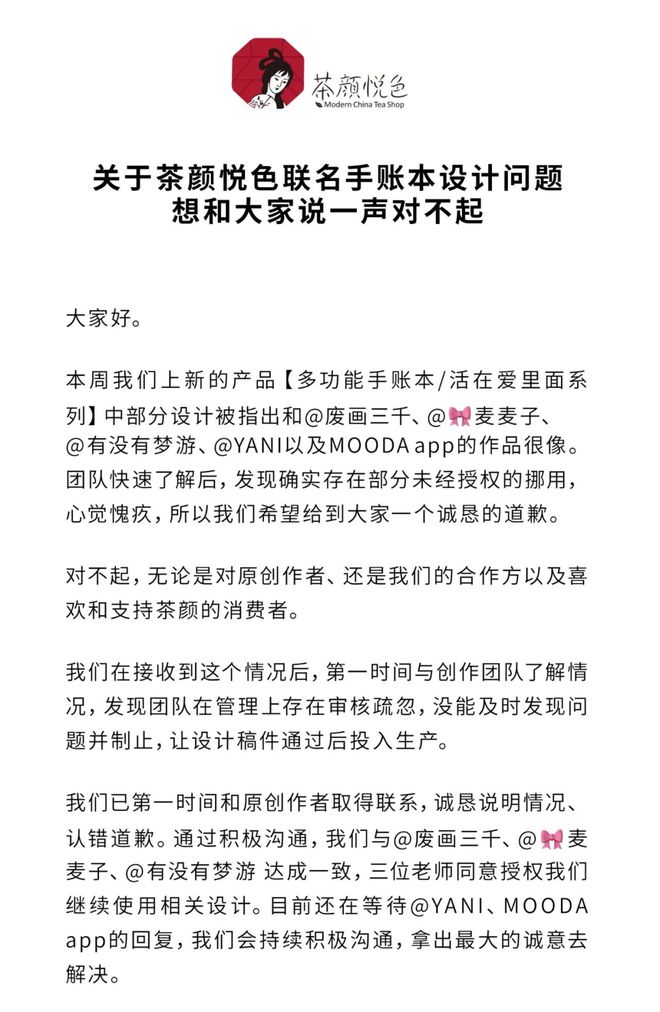 茶颜悦色在道歉声明中承认“确实存在部分未经授权的挪用”,并表示已与三位创作者达成授权合作,仍在与其他两位沟通。
