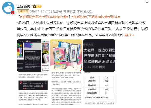 紧接着,博主“麦麦子”也站出来表示,茶颜悦色在未经本人同意的情况下抄袭了她的拼贴作品,包括手账本的封底设计和徽章。